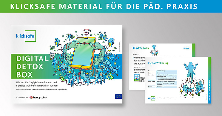 Die Digital Detox Box entstand in einer Kooperation der Projekte klicksafe und Handysektor und bietet 16 ausgewählte Methoden aus der medienpädagogischen Praxis. Die Methoden sind für den Einsatz im Schulunterricht sowie für die außerschulische Jugendarbeit konzipiert. Sie eignen sich gut für die spontane Nutzung in Vertretungsstunden. Darüber hinaus können sie in abgewandelter Form im Familienkreis kreativ eingesetzt werden.