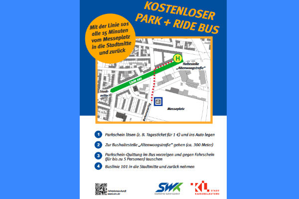 Das Angebot gilt für alle, die die Parkflächen auf dem Messeplatz nutzen und an den Parkscheinautomaten einen gültigen Parkschein erwerben. Bei Vorlage des Quittungsbeleges ist die Beförderung in den Bussen der Linie 101 der SWK in Richtung Innenstadt für bis zu fünf Personen sowohl für die Hin- als auch für die Rückfahrt kostenlos. Den Fahrschein bekommt man direkt beim Busfahrer durch Vorzeigen des Quittungsbelegs des Parkscheins mit dem Aufdruck „P+R Messeplatz“. Zwei und mehr Personen erhalten eine Gruppenkarte. Ein- und Ausstieg erfolgen in der Mannheimer Straße an den Haltestellen „Messeplatz“ sowie „Altenwoogstraße“, die sich rund 250 Meter vom Messeplatz entfernt befinden. Das Angebot richtet sich an Pendlerinnen und Pendler, die auf das Auto angewiesen sind und in der Innenstadt arbeiten. Sie können auf dem Messeplatz günstig parken und dann kostenlos die Busse in die Innenstadt benutzen. Es richtet sich aber auch an alle, die aus der Region zum Einkaufen nach Kaiserslautern kommen. Das Angebot gilt von Montag bis Samstag jeweils von 6 Uhr bis 00.00 Uhr. Es gilt nicht in Zeiträumen, in denen der Messeplatz als Parkraum nicht nutzbar ist, etwa an Kerwetagen.