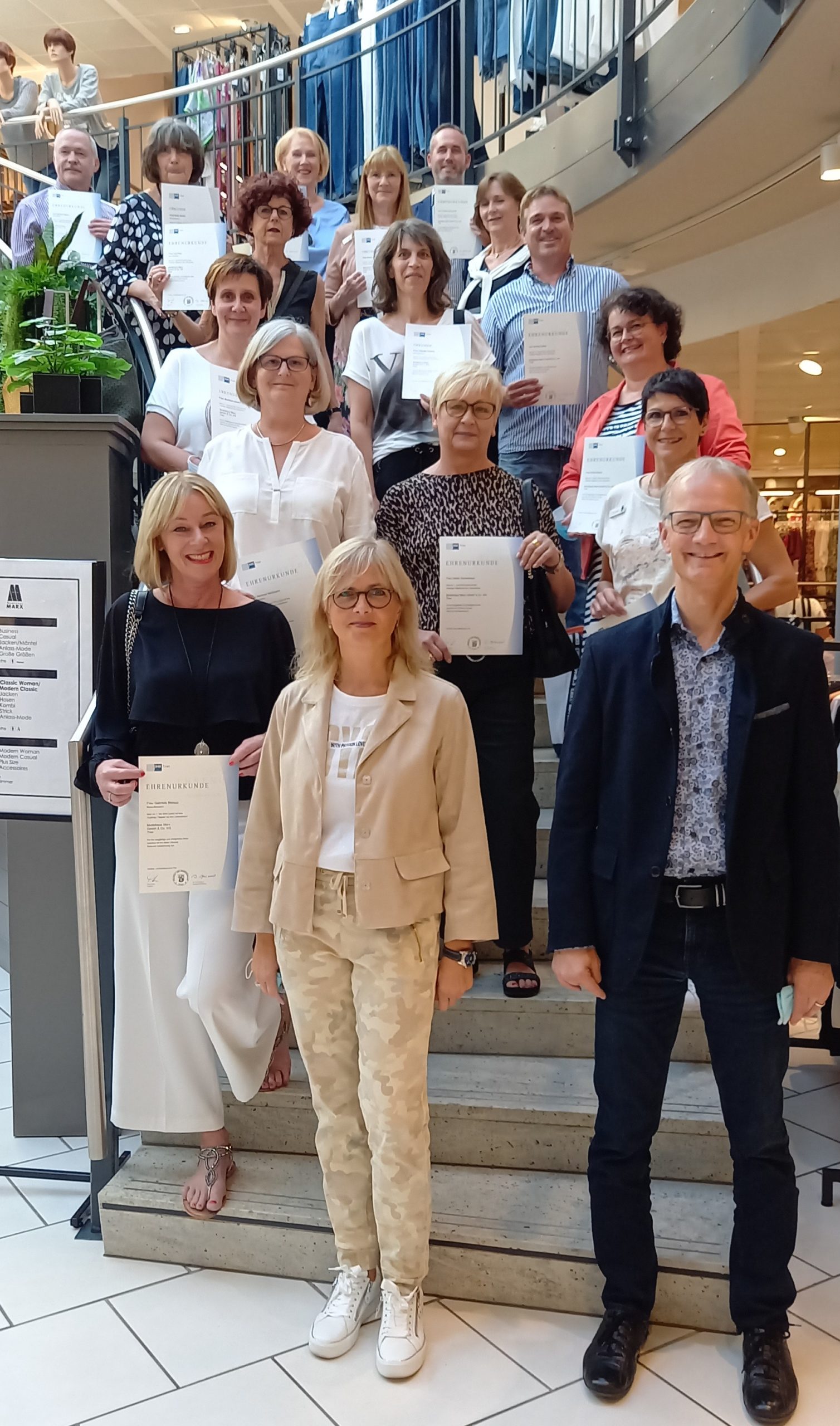 Neben Margret Kirsten begehen noch 17 weitere Kolleginnen und Kollegen gemeinsam ihr Betriebs-Jubiläum aus den Jahren 2019-2021. Über 30 Jahre stehen u.a. Marlene Fuhrmann und Manfred Wagner den Kunden beratend zur Seite. Ein ¼-Jahrhundert feiert Martina Lünser, die Leiterin des Kassen-Teams. Seit über 20 Jahren sind u.a. die Dekorateurinnen Corinna Burckhardt und Ursula Schäfer im Team, und über zehn Jahre im Modehaus Marx freut sich in diesem Jahr Einkäufer Christian Strauscheid.