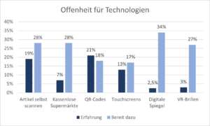 Offen für Kassenlose Supermärkte sind ebenfalls 28 Prozent. Die Erfahrung damit ist hierbei mit 7 Prozent der Befragten allerdings weitaus weniger als bei anderen Technologien. Das liegt nicht zuletzt an der geringeren Verbreitung. Um beispielsweise weiterführende Produktinformationen zu erhalten, haben 21 Prozent bisher QR-Codes gescannt, weitere 18 Prozent, könnten sich das jedoch auch für die Zukunft gut vorstellen. Ähnlich sieht es bei Beratung und Bestellungen per Touchscreen in den Läden selbst aus: Erfahrung damit haben 13 Prozent, hinzu kommen 17 Prozent, die dazu bereit wären.