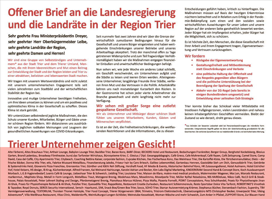 In einzelnen Regionen erheben Händler gemeinsam Ihre Stimme, wie im Raum Trier. In einem offenen Brief an die Landesregierung und die Landräte der Region fordert ein Zusammenschluss aus über 130 Unternehmern die Abschaffung der 2G-Regel.