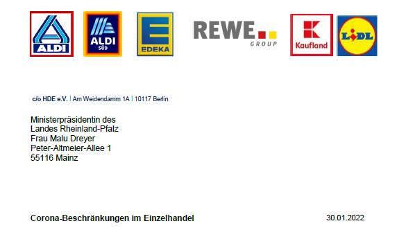 Großunternehmen aus dem Bereich des Lebensmitteleinzelhandels, wie ALDI, EDEKA, REWE und die Schwarz-Gruppe (LIDL, KAUFLAND) haben in einem Schreiben an die Ministerpräsidentin von Rheinland-Pfalz die Aufhebung der 2G-Beschränkungen gefordert.