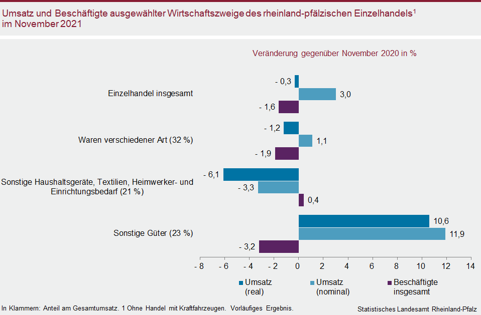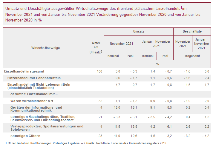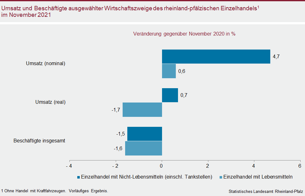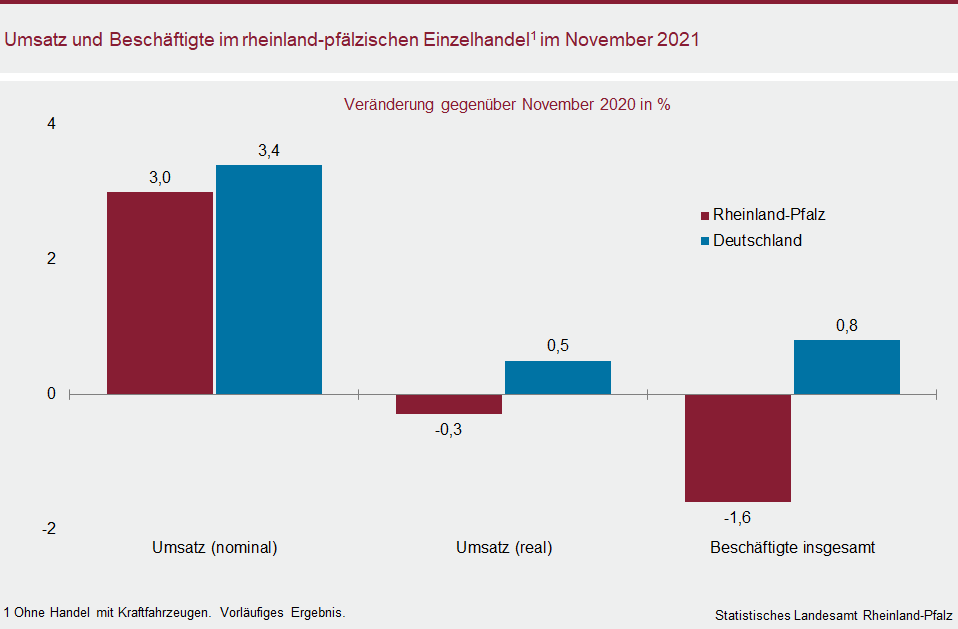 Die Preissteigerungen im November beeinträchtigten den rheinland-pfälzischen Einzelhandel. Nach vorläufigen Berechnungen des Statistischen Landesamtes in Bad Ems lagen die Einzelhandelsumsätze im November 2021 real, also um Preisveränderungen bereinigt, um 0,3 Prozent unter denen des Vorjahresmonats (Deutschland: plus 0,5 Prozent). Nominal bzw. gemessen in jeweiligen Preisen legten die Umsätze um drei Prozent zu (Deutschland: plus 3,4 Prozent).